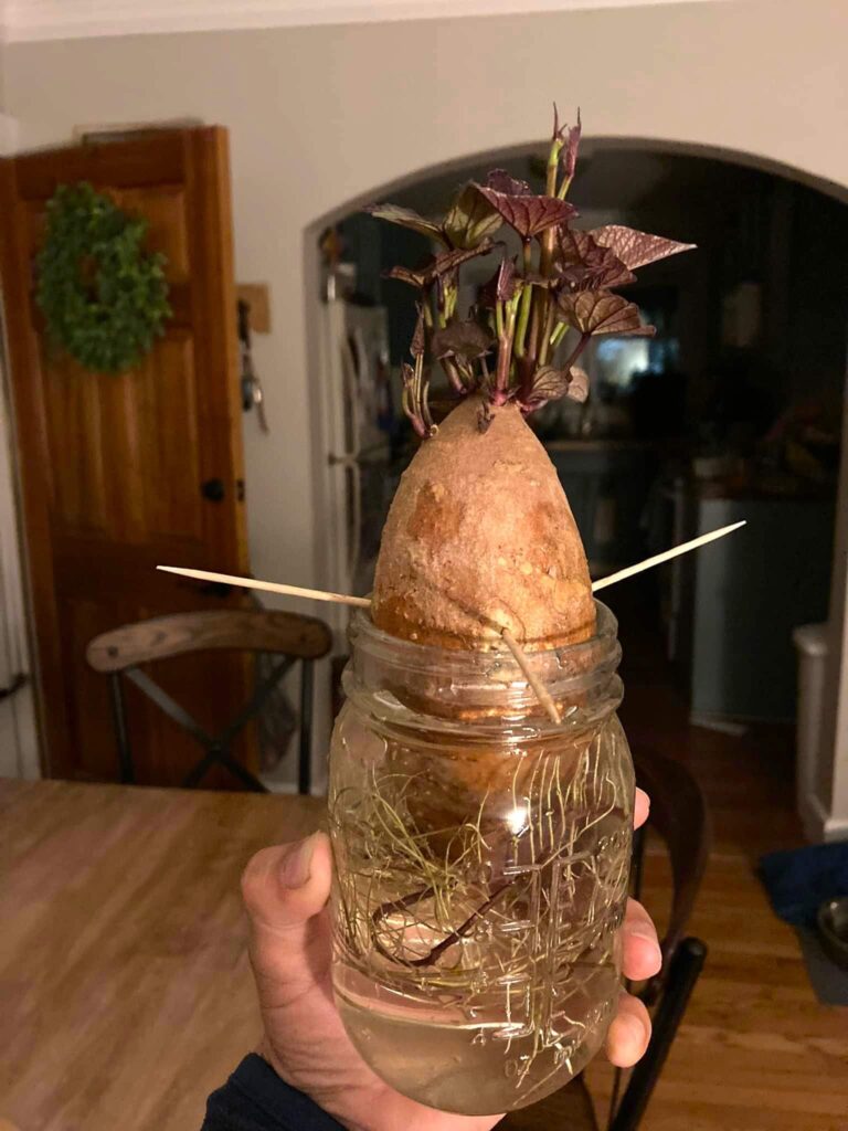 Find a sweet potato root (the edible part) big enough to fit inside a glass jar. You can also cut larger pieces to fit your container.